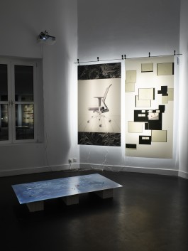 Mit seiner „Map of Tools and Collectives“ kartographiert Felix Obermaier den Werkzeugkasten des Kollektivs und der globalen OSI-Community auf einer Stahlplatte. Dünne Fäden verbinden die verschiedenen Tools mit Recherchen des Kollektivs. Die Mitglieder der Community kommen darauf in Form von Projektionen zu Wort.